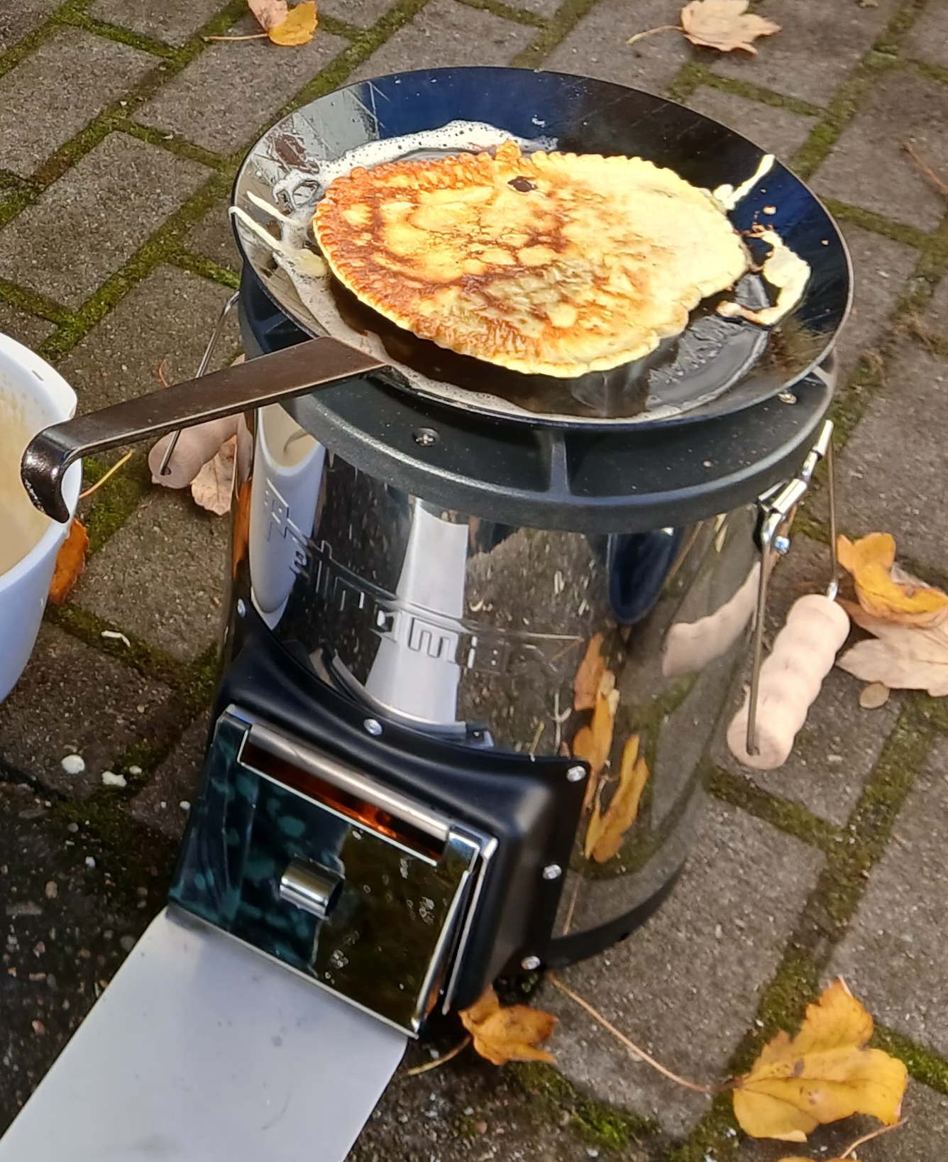 Der Raketenofen ist schnell einsatzbereit und mit wenig Lebensmittelaufwand lassen sich in kurzer Zeit Sandwiches oder Pfannkuchen machen.