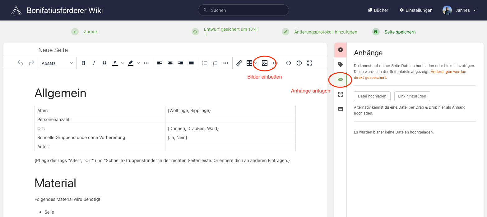 Du kannst Bilder einbetten und Anhänge (PDFs etc.) hinzufügen. Bilder lassen sich am besten direkt im Text einbetten. Hinzugefügte Anhänge werden in der Seitenleiste abgelegt. Bitte mache den Leser im Abschnitt "Anhänge" auf die von dir hochgeladenen Anhänge aufmerksam.