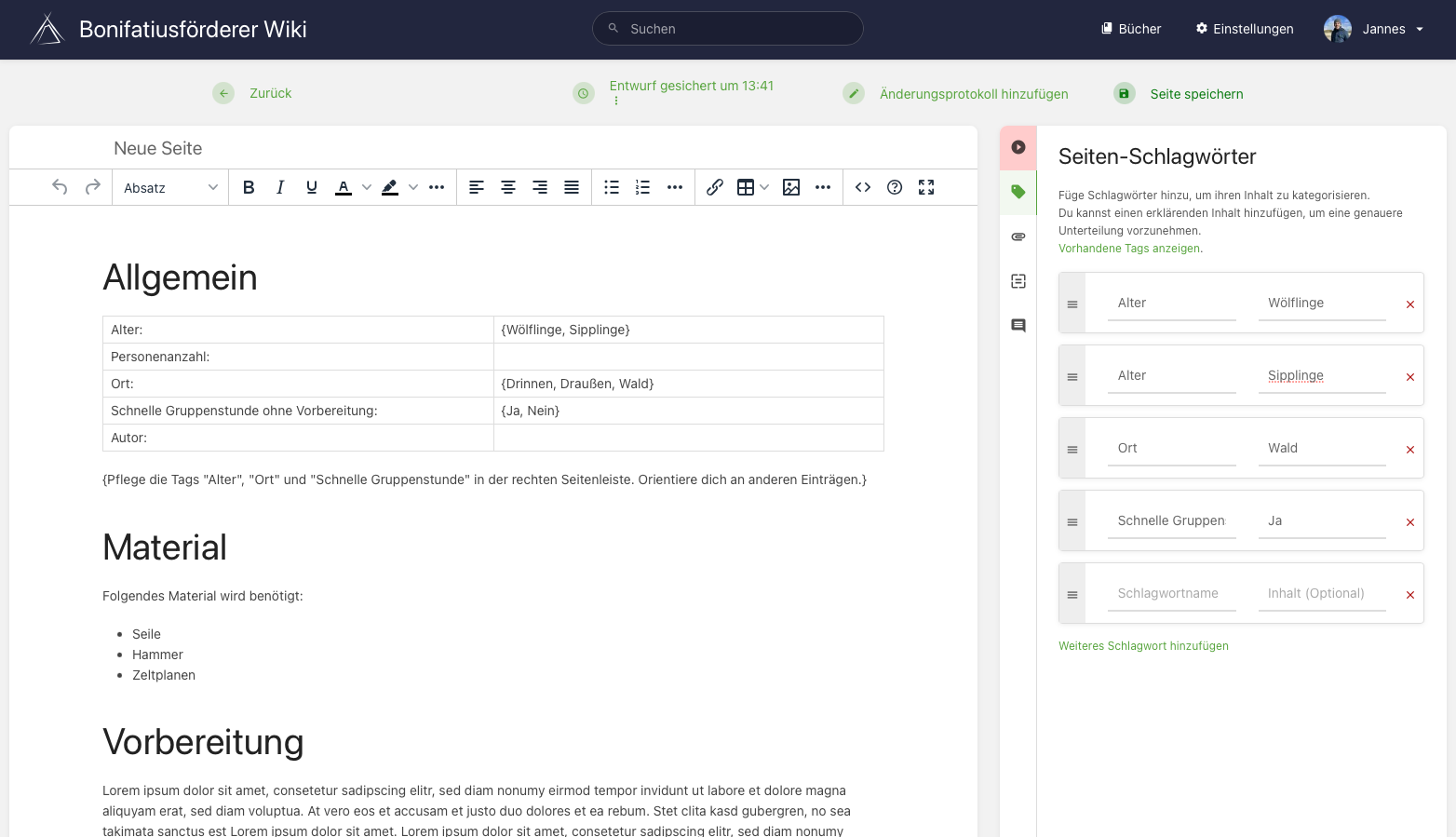 Schlagwörter erlauben das einfache Filtern aller Gruppenstunden. So kann der Leser sich Gruppenstunden anzeigen lassen, die für Wölflinge relevant sind. Damit das möglich ist, sollten die Schlagwörter in der Seitenleiste gepflegt werden. Beachte dass ein Schlagwort (z.B. Alter) auch mehrere Werte haben kann. S. Screenshot.
